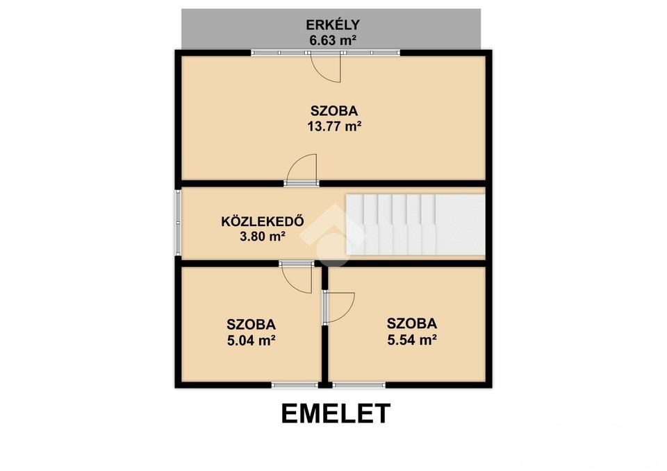 Emelet: 2 szoba, közlekedő, erkély.