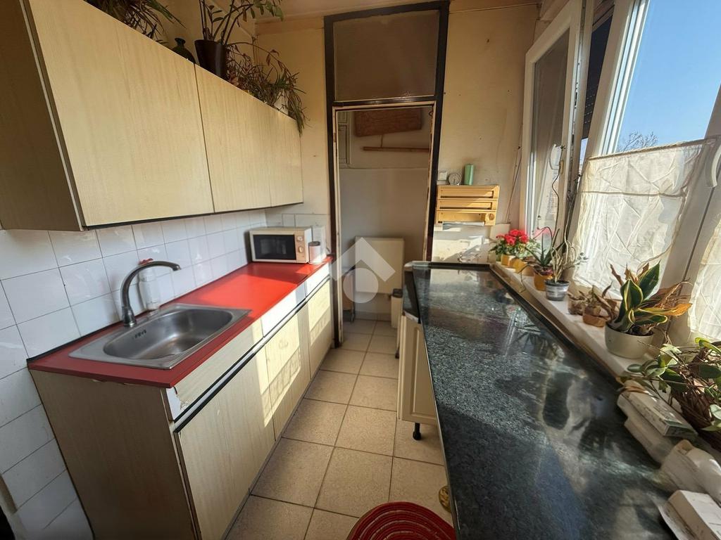 A konyha, világos, nagy ablakkal rendelkezik.