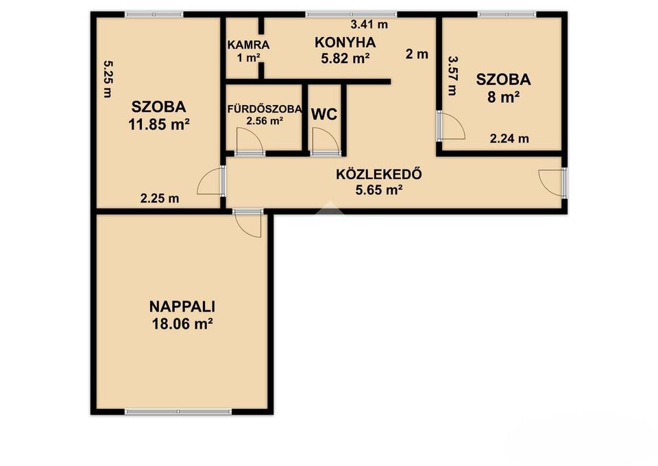 Nappali +2 félszoba, étkezős konyha + kamra, kádas fürdőszoba, wc, közlekedő, előszoba.